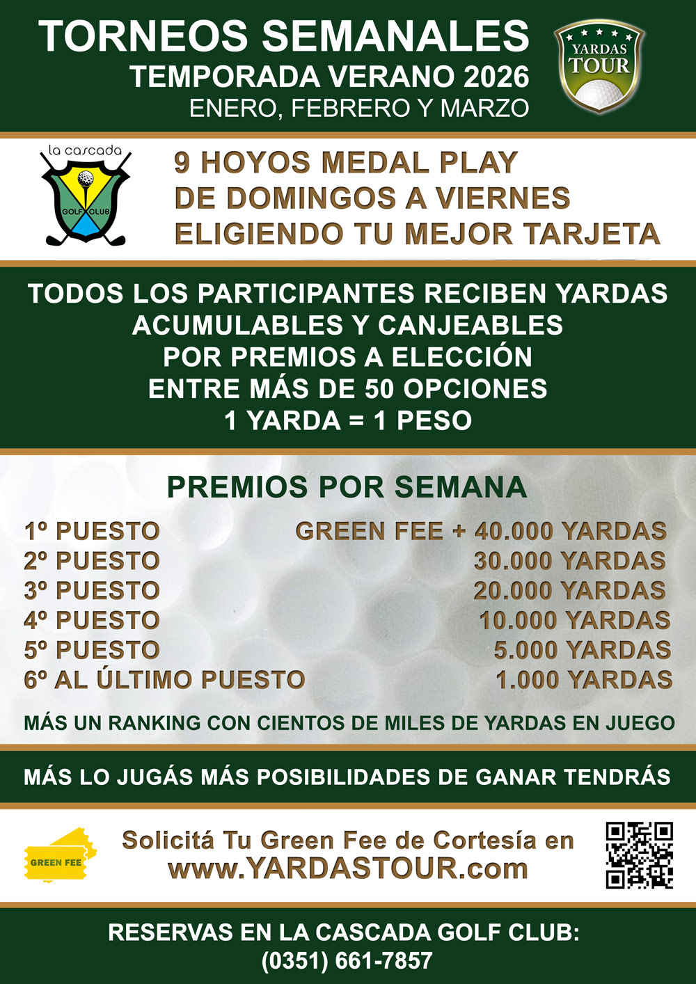 Colonia Impira esq. Cañada de GómezCiudad de Córdoba(0351) 661-7857 Resultados de Torneos del Club Verano 2026 Ranking del Club Verano 2026 Consulte aquí su Extracto de Yardas Verano 2026 Consulte sus Puntos de Ranking Verano 2026 Solicite un Green Fee de Cortesía en La Cascada Golf Club Regístrese para canjear sus Yardas Reglamento de los Torneos Yardas Tour Verano 2026 en La Cascada Golf Club