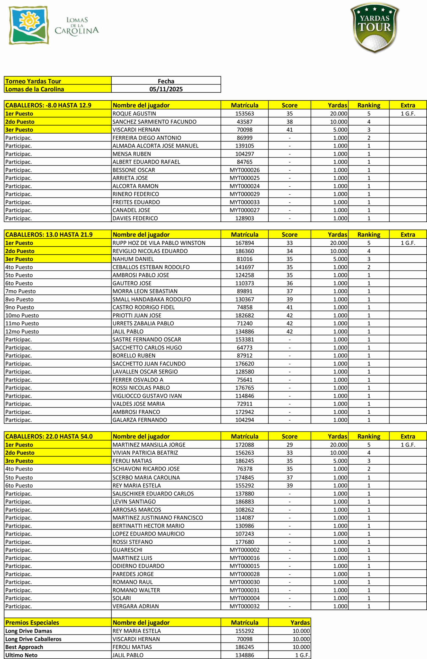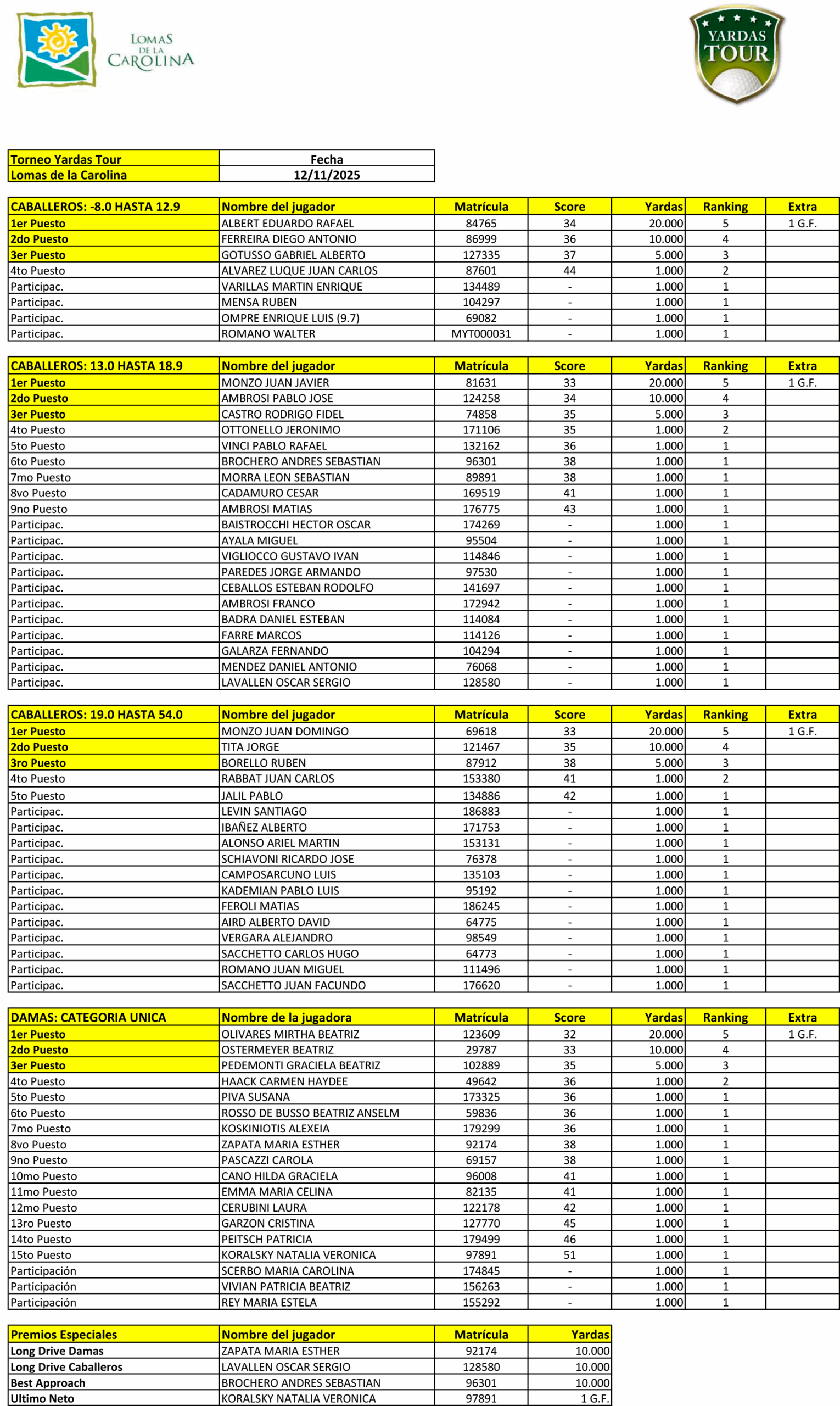 12 de Noviembre de 2025 - Resultados del Torneo Yardas Tour