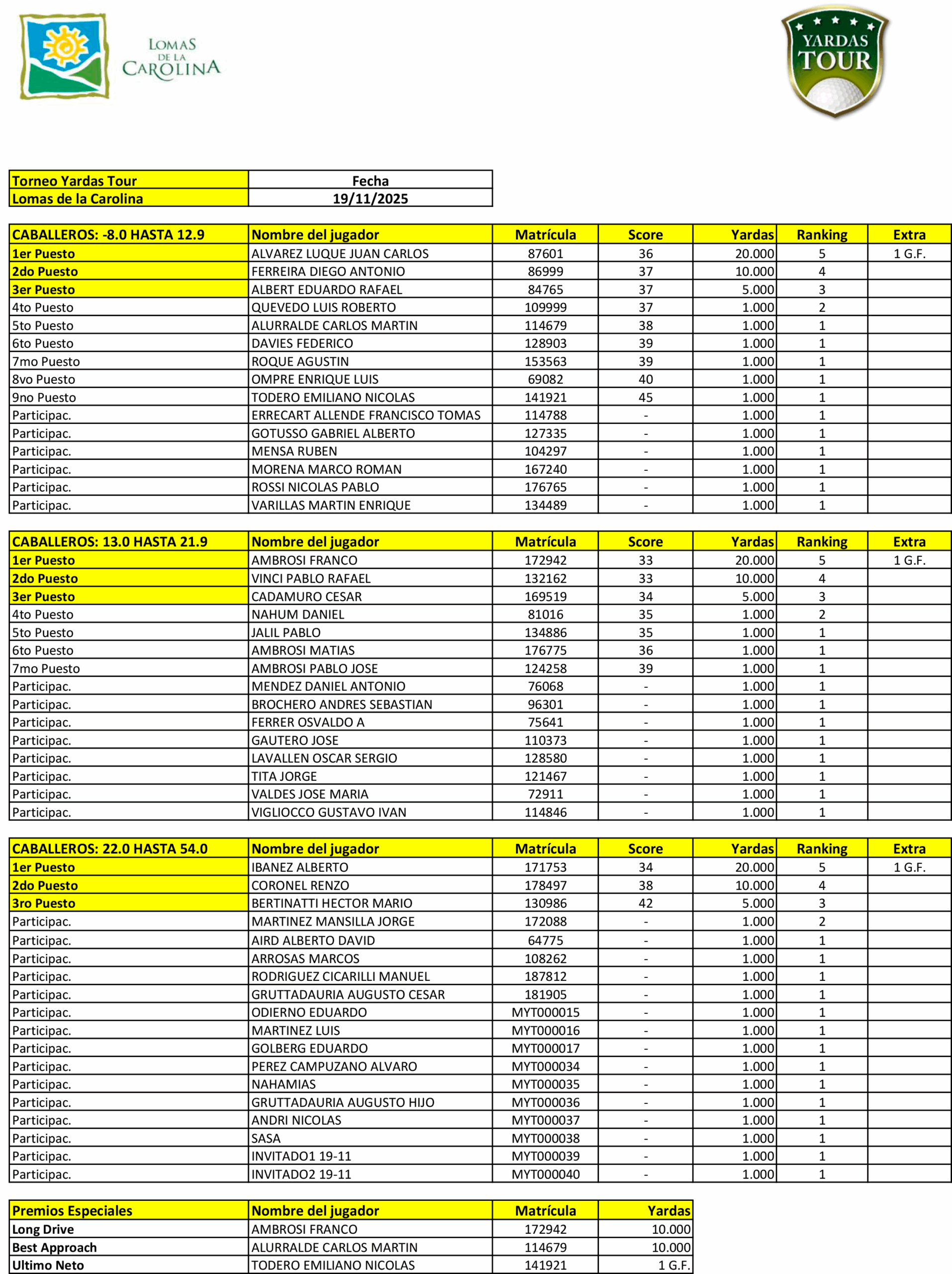 19 de Noviembre de 2025 - Resultados del Torneo Yardas Tour