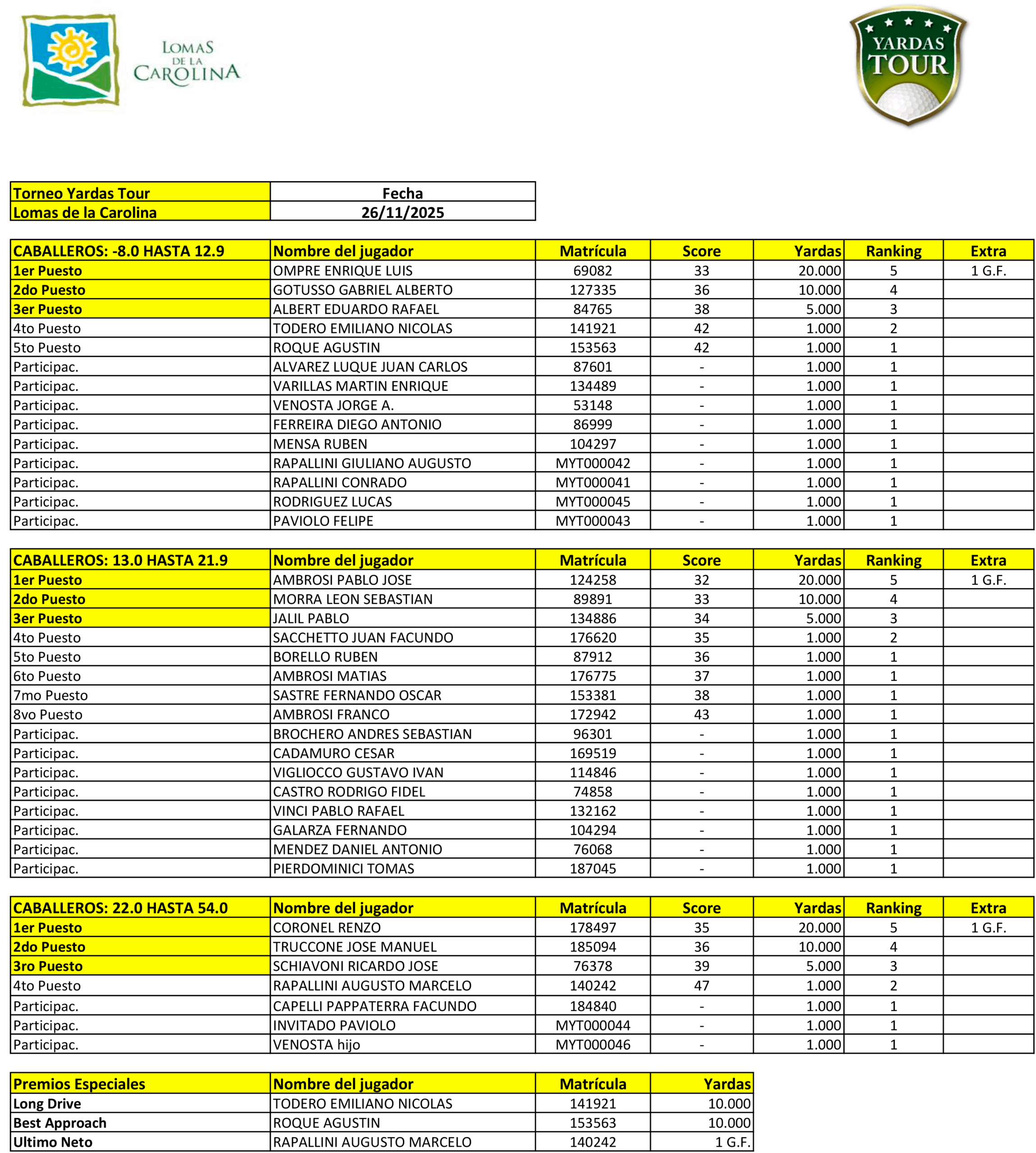 26 de Noviembre de 2025 - Resultados del Torneo Yardas Tour