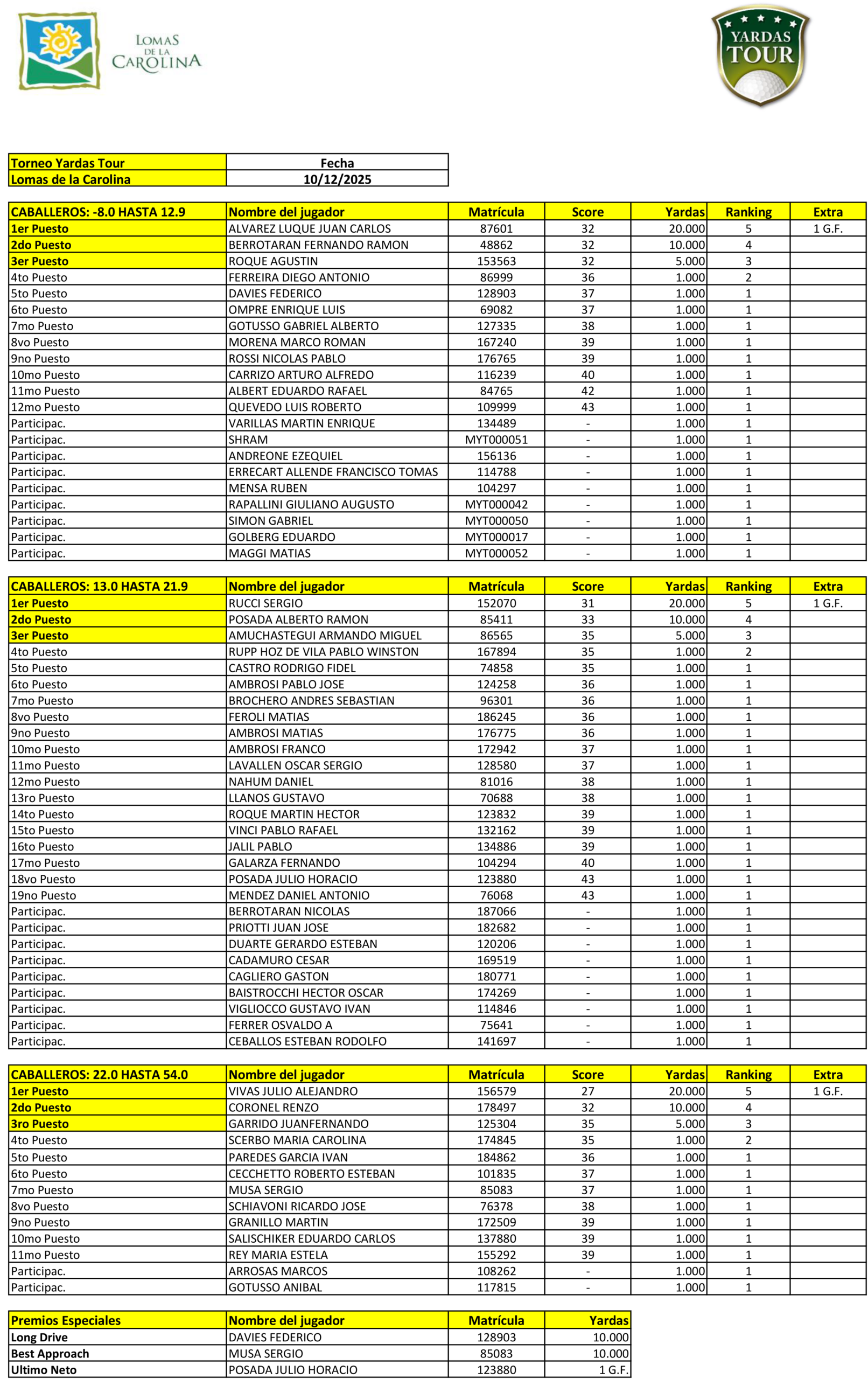 12 de Diciembre de 2025 - Resultados del Torneo Yardas Tour