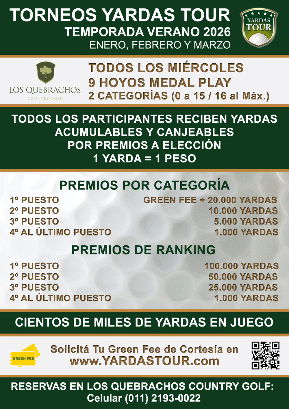 LOS QUEBRACHOS COUNTRY GOLFDr. Bernardo Houssay esq. Av. Cristo ReySan Luis – Provincia de San Luis(011) 2193-0022 Resultados de Torneos del Club Verano 2026 Ranking del Club Verano 2026 Consulte aquí su Extracto de Yardas Verano 2026 Consulte sus Puntos de Ranking Verano 2026 Solicite Green Fee de Cortesía Regístrese para canjear sus Yardas Reglamento de Torneos Yardas Tour Verano 2026 en Los Quebrachos Country Golf